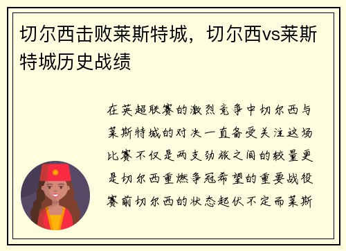 在英超联赛的激烈竞争中,切尔西与莱斯特城的对决一直备受关注。这场比赛不仅是两支劲旅之间的较量,更是切尔西重燃争冠希望的重要战役。赛前,切尔西的状态起伏不定,而莱斯特城则凭借其顽强的防守和高效的进攻,稳居积分榜前列。切尔西在这场比赛中展现出了强大的实力和团队精神,最终以2-1的比分击败了莱斯特城。