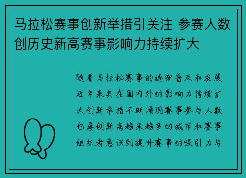 随着马拉松赛事的逐渐普及和发展,近年来其在国内外的影响力持续扩大,创新举措不断涌现,赛事参与人数也屡创新高。越来越多的城市和赛事组织者意识到,提升赛事的吸引力与影响力,不仅仅依赖于传统的赛事形式,而是需要通过创新的思路与措施来激发更多人的参与和关注。从赛事内容的创新,到参赛体验的提升,再到赛事品牌的全球化推广,马拉松赛事的多元化改革措施日益显现出巨大的潜力。本文将从四个方面对马拉松赛事创新举措引关注、参赛人数创历史新高、赛事影响力持续扩大的现象进行详细阐述,分别探讨赛事创新的具体举措、参赛人数激增的原因、赛事影响力扩大的路径以及未来发展趋势。