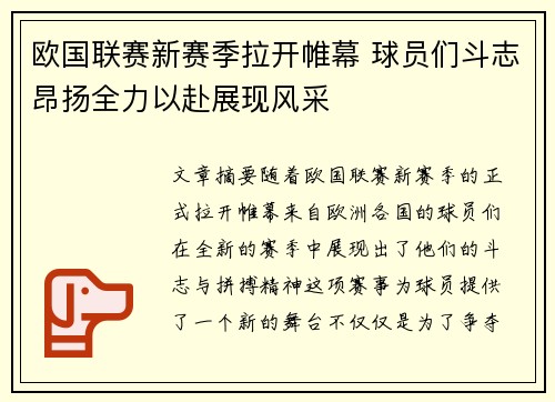 随着欧国联赛新赛季的正式拉开帷幕,来自欧洲各国的球员们在全新的赛季中展现出了他们的斗志与拼搏精神。这项赛事为球员提供了一个新的舞台,不仅仅是为了争夺荣誉,更是为提升球队实力和个人水平提供了丰富的机会。对于许多球员来说,欧国联赛不仅是一次展示自我的机会,更是为接下来的国际大赛做好充分准备的重要平台。本文将从四个方面详细阐述欧国联赛新赛季的特点以及球员们全力以赴的表现。这四个方面分别是:赛事的全新开局与重要性、球员的激烈竞争与拼搏精神、战术体系的革新与球队的协作、欧国联赛对球员未来发展的影响。在这些方面的深度分析下,我们可以更全面地了解欧国联赛对球员、教练、乃至整个欧洲足球格局所带来的深远影响。