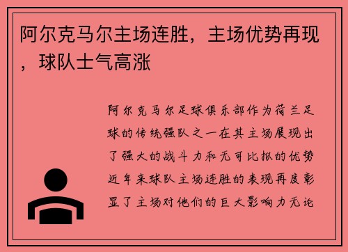 阿尔克马尔的主场连胜不仅仅是他们个人能力的体现,更是球队与球迷、战术以及环境之间完美配合的结果。球队的主场优势、球迷的支持、战术的执行以及士气的高涨,最终使得阿尔克马尔在自家球场上屡屡取得胜利,并不断提升其在国内外赛事中的竞争力。